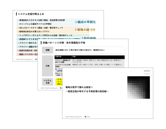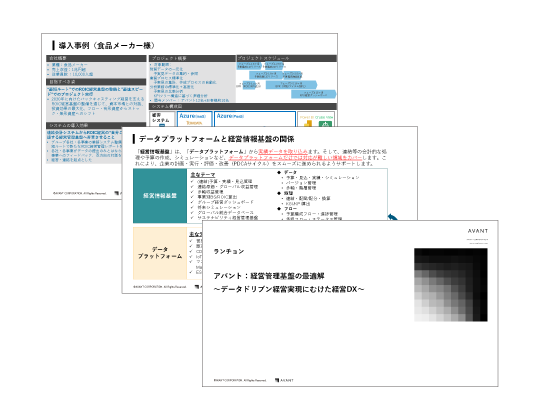 製品資料 3分でわかるAVANT Cruise(製品紹介資料) AVANT Cruiseは、経営管理のベストプラクティスを体系的にパッケージ化し、迅速かつ容易に経営管理の効率化・高度化を実現するクラウドサービスです。 詳細はこちら
