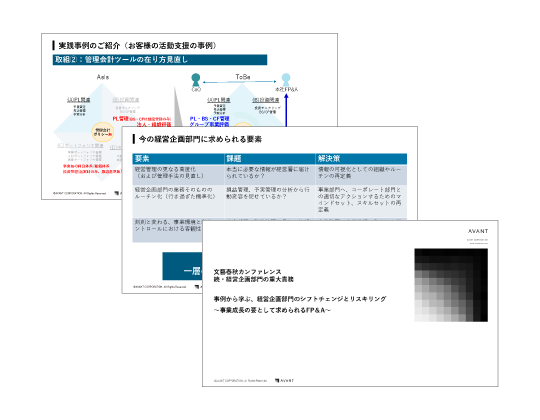 講演資料 文藝春秋カンファレンス 続・経営企画部門の重大責務 アバント講演資料 文藝春秋が主催する「文藝春秋カンファレンス 続・経営企画部門の重大責務」(2025年3月7日)にて、アバントが講演を行った『事例から学ぶ、経営企画部門のシフトチェンジとリスキリング ~事業成長の要として求められるFP&A~』の資料を無料ダウンロードいただけます。 詳細はこちら
