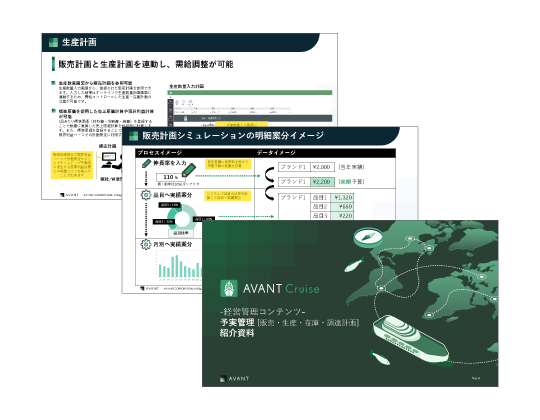 製品資料 AVANT Cruise 予実管理コンテンツ紹介資料 「AVANT Cruise 予実管理コンテンツコンテンツ [販売・生産・在庫・調達計画] 紹介資料」の紹介資料を無料でダウンロードいただけます。 詳細はこちら