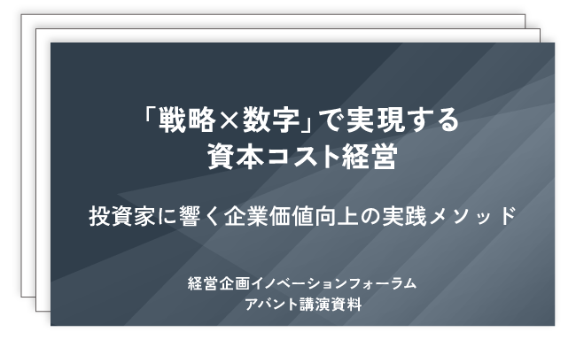 講演資料 「戦略×数字」で実現する資本コスト経営~投資家に響く企業価値向上の実践メソッド~ アバント講演資料「「戦略×数字」で実現する資本コスト経営」を無料ダウンロードいただけます。 詳細はこちら